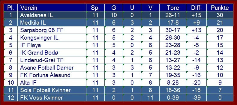 Sesongen av den norske øverste divisjon i fotball for kvinner. Fra de viktigste ligaene tilbyr vi kampfakta toppscorerlister assists kort og en rekke andre statistikker. Serien ble avgjort i 21.